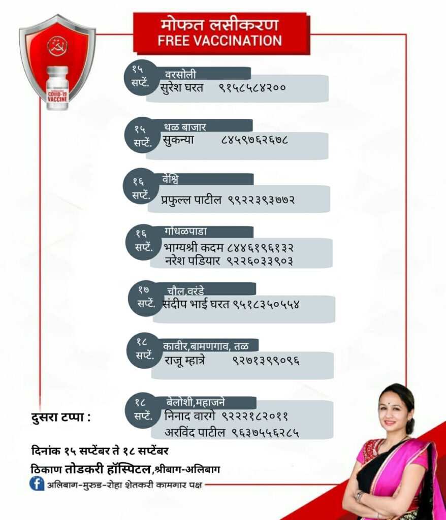 कोरोनाची साखळी मोडण्यासाठी लस घेणे खूप गरजेचे आहे. रायगड जिल्ह्यासह अलिबाग तालुका कोरोनाचे हॉटस्पॉट बनत असून लॉकडाऊन केले तर लोकांवर बेरोजगारी आणि उपासमारीची वेळ येऊ शकते. त्यामुळे नागरिकांचे लसीकरण करणे अत्यंत गरजेचे आहे. अशातच लसींचा मोठ्या प्रमाणात तुटवडा आहे. गावोगावी लस पोहचलेली नाही. हे लक्षात घेऊन शेतकरी कामगार पक्षाने दि. 1 ते 8 सप्टेंबर रोजी मोफत लसीकरण मोहिमेस सुरुवात केली. यावेळी शेकाप जिल्हा महिला आघाडी प्रमुख चित्रलेखा पाटील यांनी अत्यंत चोख नियोजन करुन लसीकरणाचा पहिला टप्पा यशस्वीरित्या पार पाडला. याच पार्श्वभूमतीवर आता दि. 15 सप्टेंबरपासून मोफत लसीकरणाचा दुसरा टप्पा सुरु होणार आहे.