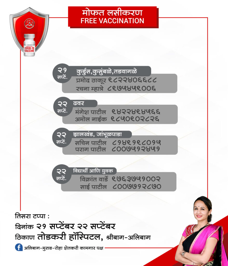 कोरोनाची साखळी मोडण्यासाठी लस घेणे खूप गरजेचे आहे. मदत नाही तर कर्तव्य हे ब्रीदवाक्य घेऊन शेतकरी कामगार पक्षाच्या माध्यमातून आणि जिल्हा महिला आघाडी प्रमुख चित्रलेखा पाटील यांच्या पुढाकाराने अलिबागमध्ये मोफत लसीकरण मोहिम राबविण्यास सुरुवात करण्यात आली. मंगळवारी या मोहिमेच्या तिसर्या टप्प्यास सुरुवात होत आहे. शेकापच्या माध्यमातून दि. 1 ते 8 सप्टेंबर रोजी मोफत लसीकरणाचा पहिला टप्पा व दि. 15 ते 18 सप्टेंबर रोजी दुसर्या टप्पा यशस्वीरित्या पार पडला. यावेळी शेकाप जिल्हा महिला आघाडी प्रमुख चित्रलेखा पाटील यांनी अत्यंत चोख नियोजन केले होते.