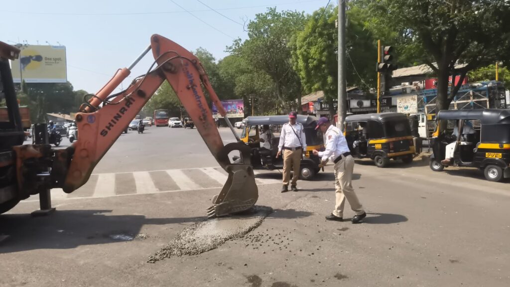 पनवेल वाहतूक शाखेच्या पोलिसांनी अपघात टाळण्याच्या उद्देशाने रस्त्यावर पडलेले खड्डे भरुन घेतल्याने त्यांच्या उपक्रमाचे कौतुक होत आहे.