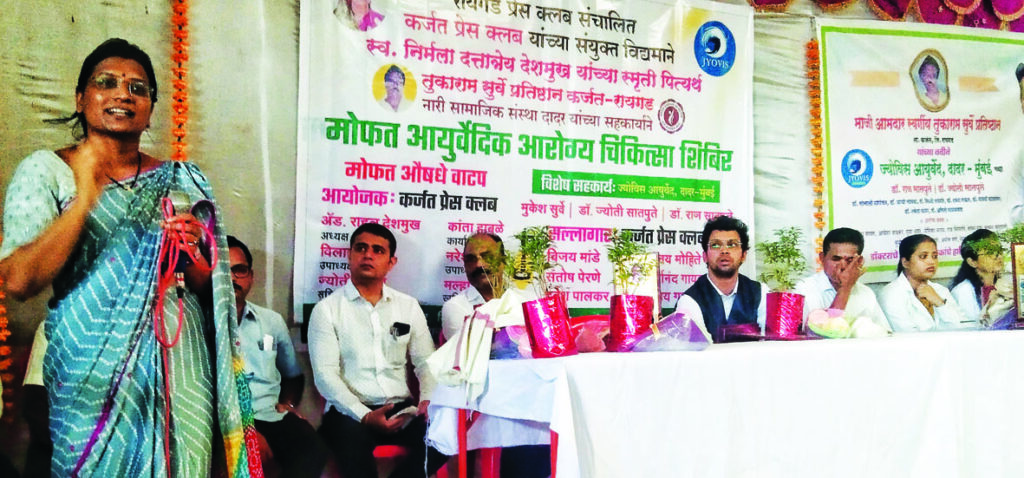 आयुर्वेद हे प्राचीन काळापासून आहे. त्याचे महत्त्व आपल्यापेक्षा पाश्चिमात्य देशांना जास्त आहे. ते त्याचा अभ्यास करीत आहेत. आयुर्वेदाच्या उपचाराने रोग मुळापासून निघून जातो. खरे तर, आयुर्वेद ही भारतीयांची खरी ओळख आहे. ग्रामीण भागात गावांच्या आजूबाजूलाच वनौषधी आहेत, याची तेथील लोकांना माहीत नसते. त्याची माहिती त्यांना करून दिल्यास अनेक व्याधींची मुक्ती होईल’ असा विश्वास कर्जत व माथेरान नगरपरिषदेच्या मुख्याधिकारी सुरेखा भणगे यांनी व्यक्त केला. कर्जत प्रेस क्लबच्या वतीने स्व. निर्मला देशमुख यांच्या स्मरणार्थ तुकाराम सुर्वे प्रतिष्ठान, नारी सामाजिक संस्था यांच्या सहकार्याने मोफत आयुर्वेदिक चिकित्सा शिबीर आणि मोफत औषधे वाटप समारंभाचे आयोजन करण्यात आले होते. या शिबिराला ज्योविस आयुर्वेद दादर मुंबईचे विशेष सहकार्य लाभले होते.