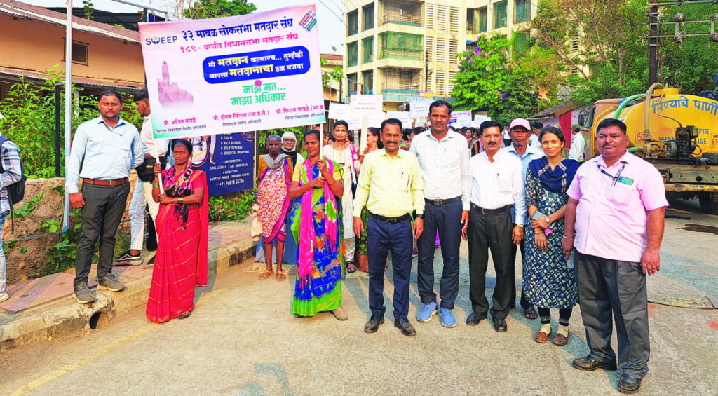 मावळ लोकसभा मतदारसंघातील कर्जत विधानसभा मतदारसंघात मतदार जनजागृती रॅलीचे आयोजन करण्यात आले होते. त्यावेळी नेरळ मंडळ अधिकारी कार्यालयाकडून निघालेल्या रॅलीत नेरळ विभागातील अंगणवाडी सेविका, मदतनीस तसेच महिला बचत गटांच्या महिला यांच्यासह मोठया संख्येने नागरिक सहभागी झाले होते. तालुक्याचे तहसीलदार डॉ. शीतल रसाळ आणि नेरळ पोलीस ठाण्याचे प्रभारी अधिकारी शिवाजी ढवळे यांनी रॅली ला हिरवा झेंडा दाखवल्यानंतर रॅली मतदार राजाला आवाहन करणाऱ्या घोषणा देत पुढे निघाली. चावडी येथून निघालेली रॅली पुढे हुतात्मा हिराजी पाटील चौकातून माथेरान नेरळ रस्त्याने छत्रपती शिवाजी महाराज चौक अशी महावीर पेठ जुनी बाजारपेठ अशी बापूराव धारप सभागृह येथे पोहचली. तेथील छत्रपती शिवाजी महाराज मैदान येथे रॅलीचा समरोप तहसीलदार डॉ. रसाळ यांनी मार्गदर्शनाने झाला. त्याआधी तहसीलदार यांनी रांगोळी स्पर्धेतील सहभागी कलाकार यांनी काढलेल्या रांगोळ्या यांची पाहणी केली.