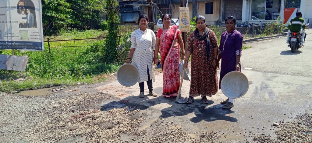 महिलांनी बुजवला रस्त्यावरील खड्डा